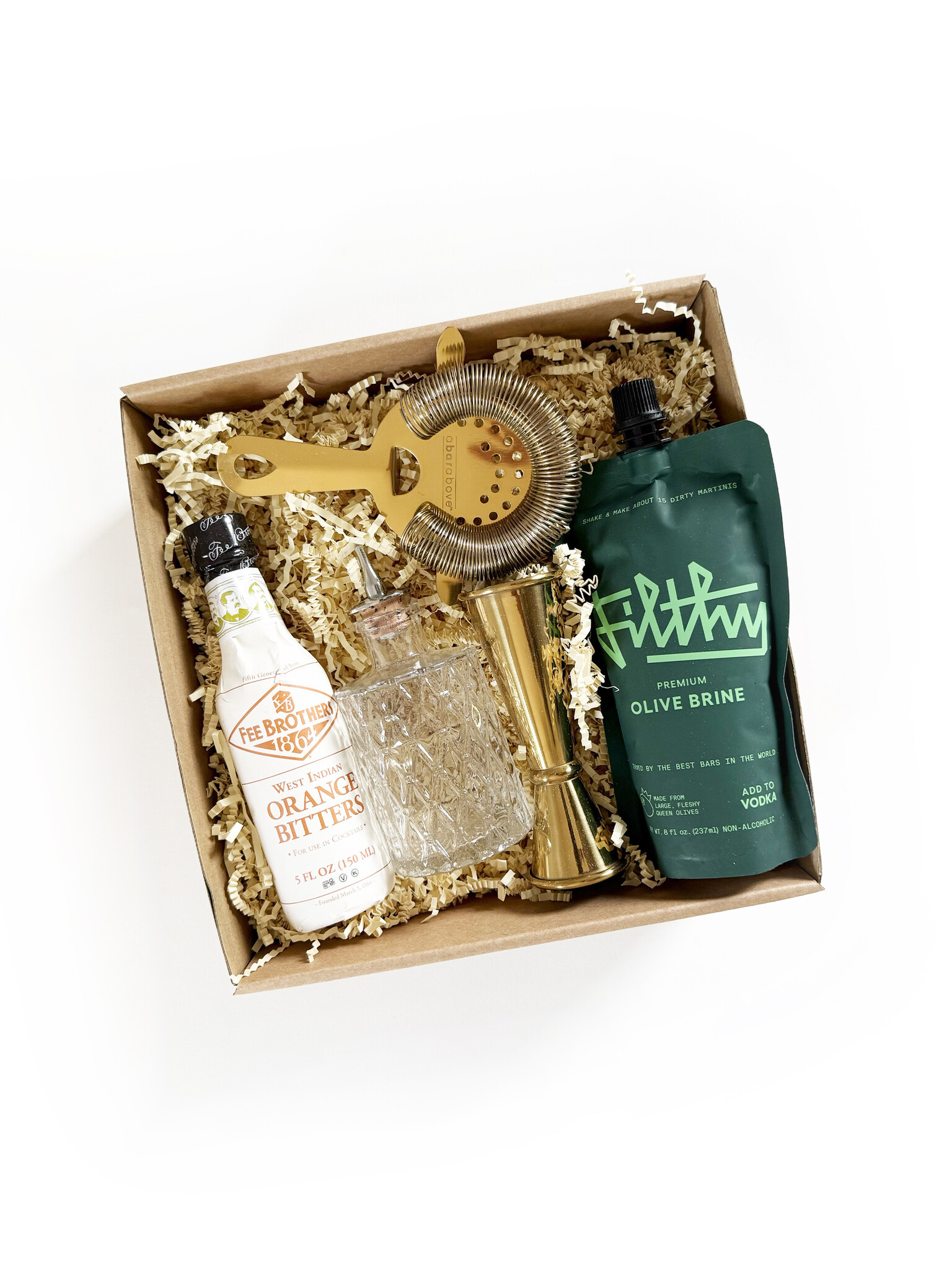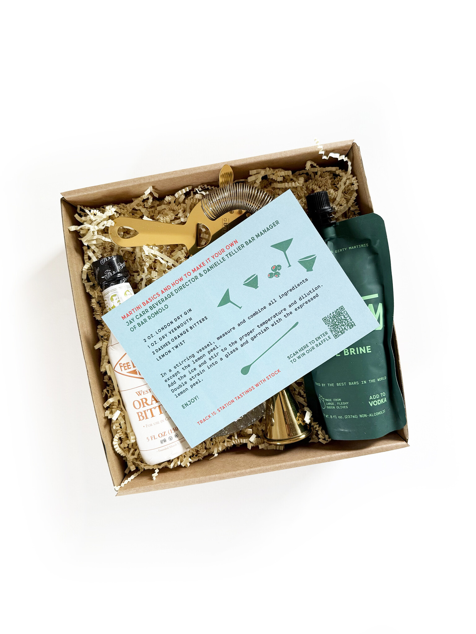 These gift boxes are inspired by the chefs at Providence's food hall Track 15, and our Station Tastings cooking demo series. Every gift box corresponds with a recipe provided by each of the restaurants at Track 15. This gift contains the goods to create Bar Romolo's Martinis at home: Fee Brothers Orange Bitters, Filthy Olive Brine, A Bar Above Gold Hawthorne Strainer, A Bar Above Gold Japanese Double Jigger, and a Barfly Glass Bitters Bottle.