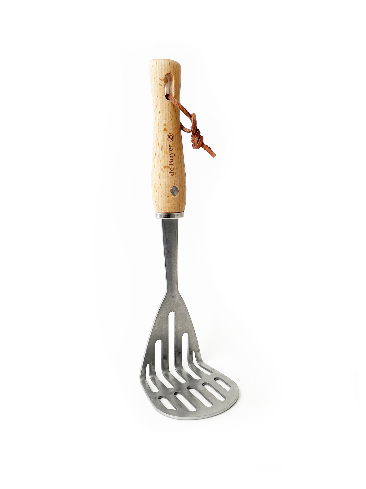 The Debuyer Stainless & Wood Masher is made with stonewashed stainless steel to withstand high temperatures. The beechwood handle provides a firm grip.