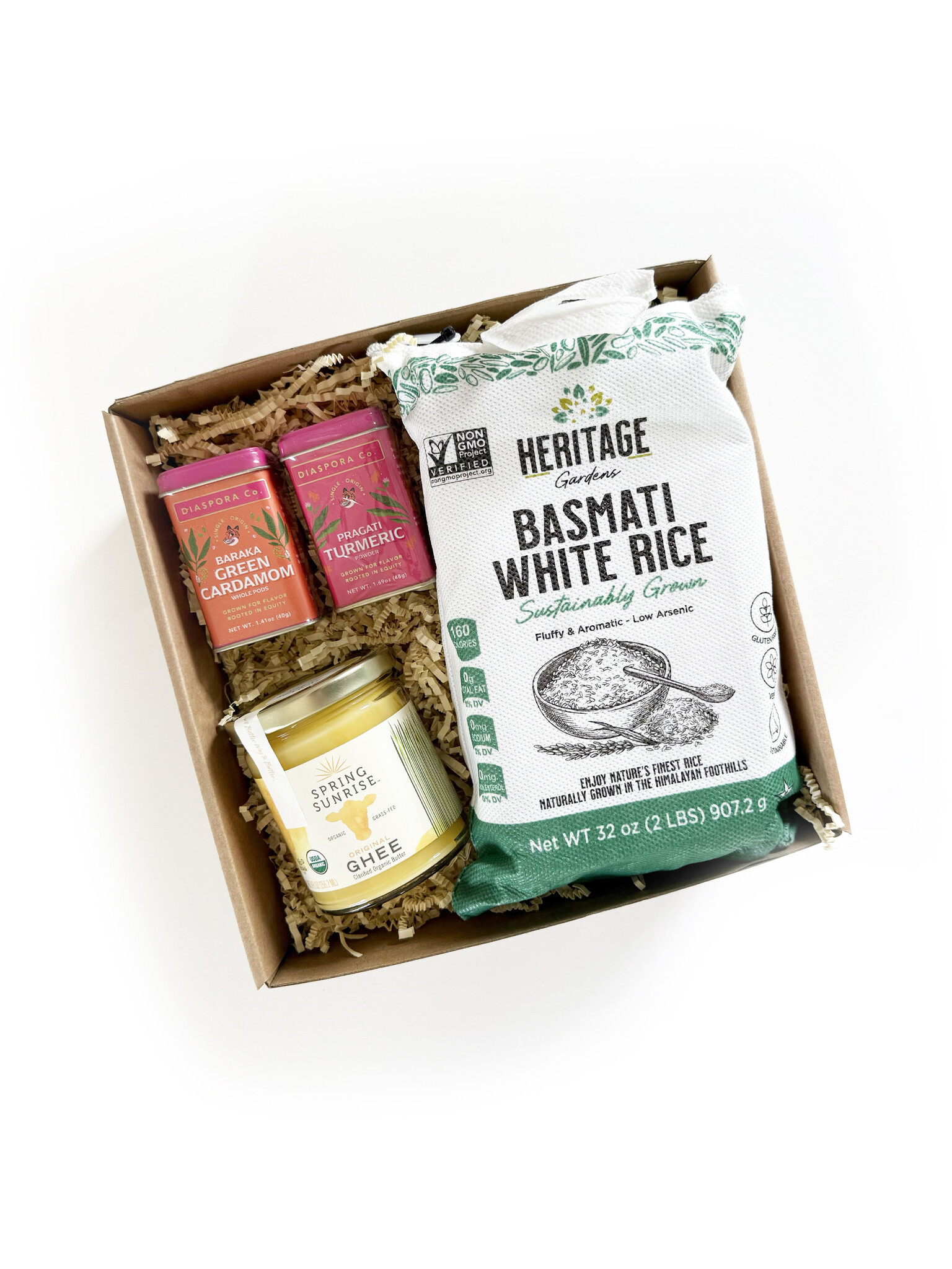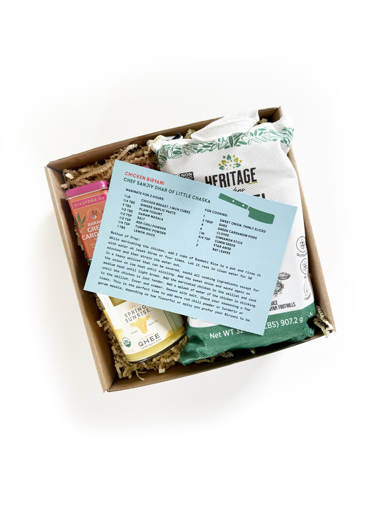 These gift boxes are inspired by the chefs at Providence's food hall Track 15, and our Station Tastings cooking demo series. Every gift box corresponds with a recipe provided by each of the restaurants at Track 15. This gift contains the goods to create Little Chaska's Chicken Biryani at home: Heritage Basmati Rice, Spring Sunrise Ghee, and Diaspora Co. Turmeric and Green Cardamom.