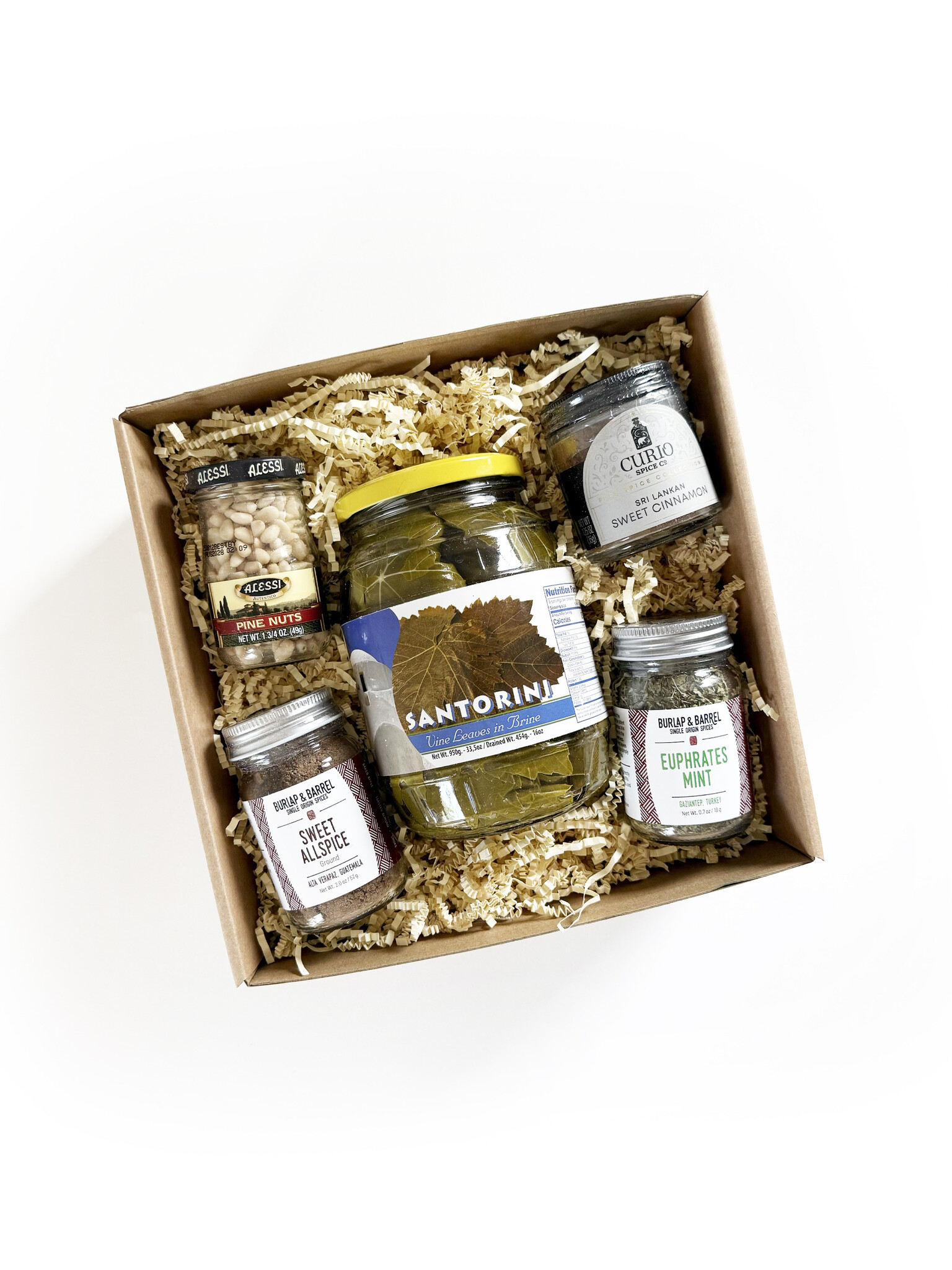 These gift boxes are inspired by the chefs at Providence's food hall Track 15, and our Station Tastings cooking demo series. Every gift box corresponds with a recipe provided by each of the restaurants at Track 15. This gift contains the goods to create Tolia's Olive Oil Braised Grape Leaves (Yaprak Sarma) at home: Alessi Pine Nuts, Burlap & Barrel Sweet Allspice, Curio Cinnamon, Burlap & Barrel Dried Mint, and Santorini Grape Leaves.