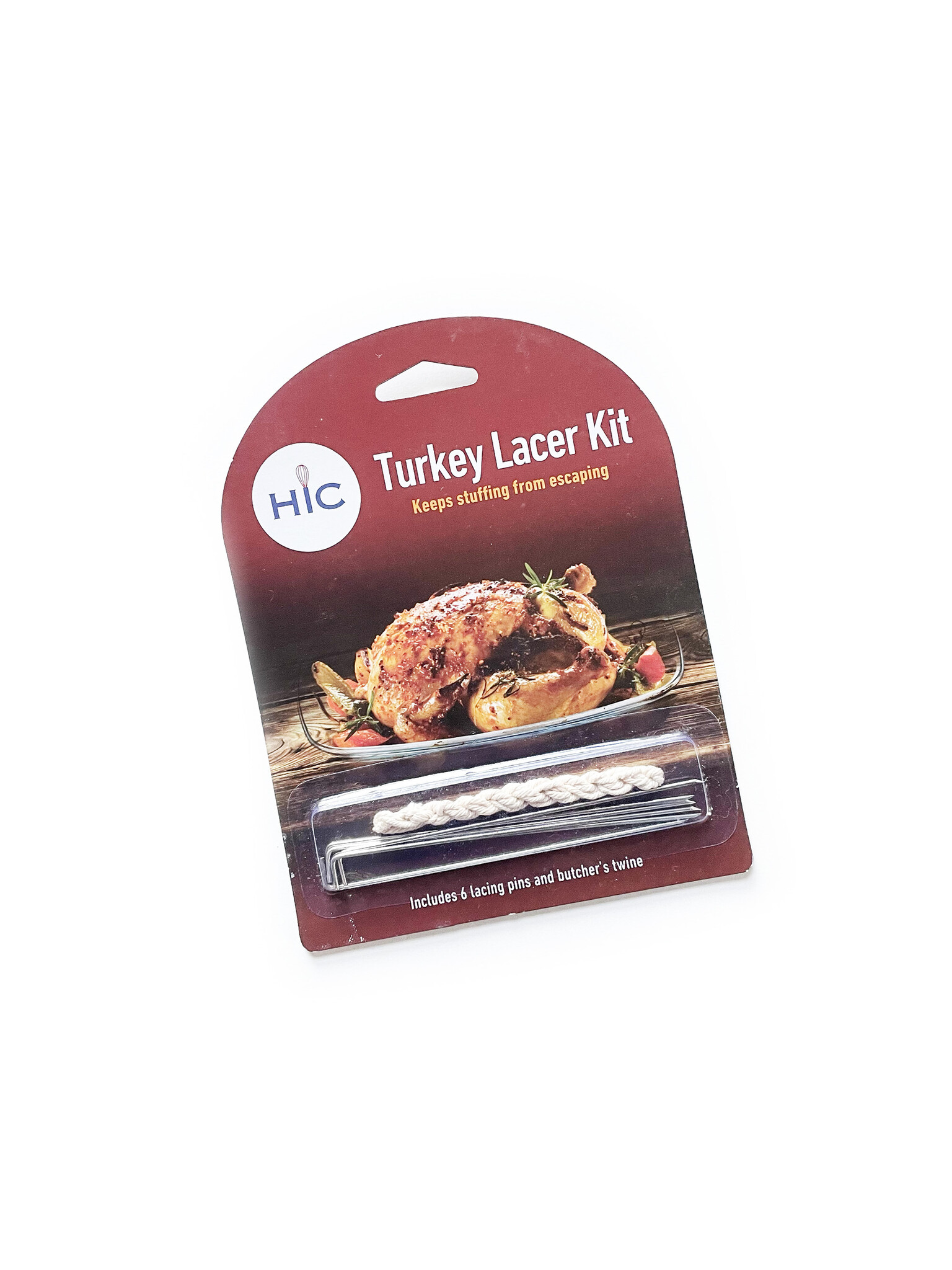 HIC's Turkey Lacer Kit works wonderfully for lacing turkey and other stuffed poultry, meats, fish, chops, wild game, and more. The kit includes 6-each reusable stainless steel pins and single-use 100-percent cotton butcher's twine.
